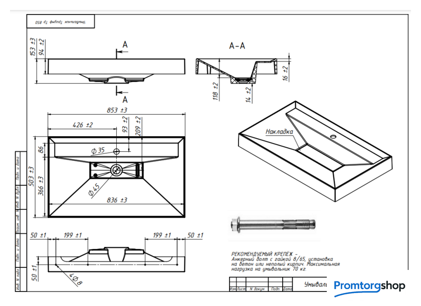 | Перелив | нет. Отверстие для смесителя по центру чаши |