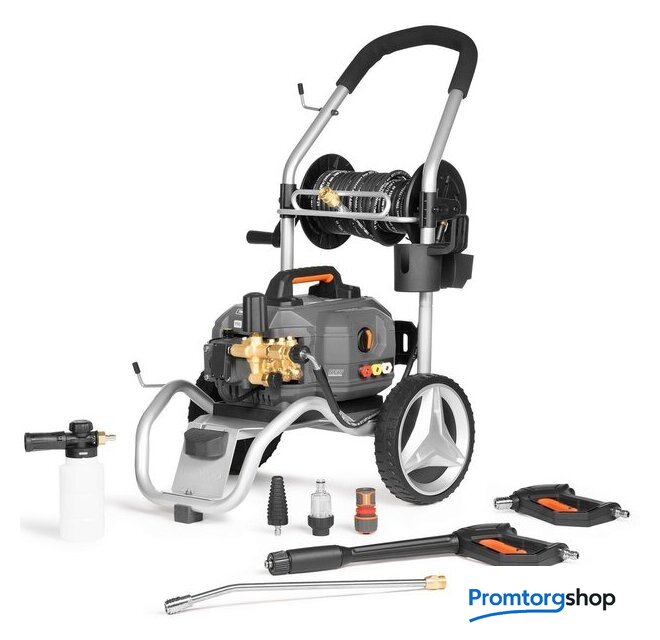 Комплектация | - Мойка высокого давления- Профессиональный пистолет с металлическим соплом- Дополнительный, короткий пистолет- Катушка с шлангом высокого давления- Рукоятка тележки- Три быстросъемные насадки-форсунки 0°/25°/40°- Грязевая фреза- Пеногенератор- Насадка - копье- Фильтр тонкой очистки- Быстросъёмный коннектор 1/2 с аквастопом- Игла для прочистки форсунки |