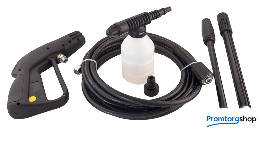 Комплектация | пистолет-распылитель, удлинитель пистолета с соплом, гибкий шланг высокого давления, емкость для моющих средств, переходник, игла для очистки сопла |