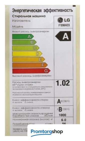 | Расход электроэнергии за цикл | 1.02 кВт·ч |