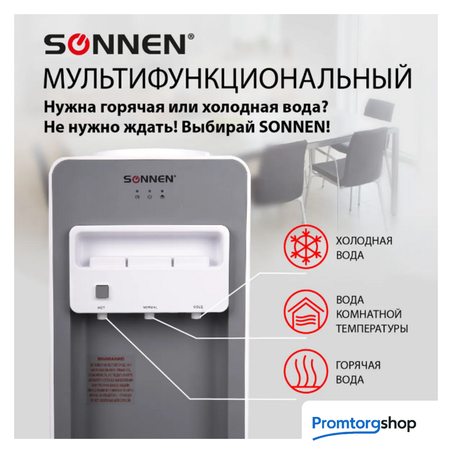 | Тип установки | Напольный кулер FSC-03BA обеспечит питьевой холодной и горячей водой сотрудников и посетителей предприятий, офисов и других организаций. Вода нагревается с помощью ТЭНа мощностью 420 Вт, что позволяет достичь температуры 90 °С за считанные минуты. Компрессорное охлаждение мощностью 85 Вт обеспечивает поддержание температуры холодной воды на уровне 10 °С. Кулер предназначен для напольного размещения и имеет 3 крана типа "клавиша", а также защиту от протечек воды. Кулер оборудован функцией «Защита от детей» на кнопке подачи горячей воды и позволяет разливать воду комнатной температуры. «Защита от детей» предотвращает случайную подачу горячей воды. Чтобы налить горячую воду, необходимо нажать на серый фиксатор и нажать кнопку подачи горячей воды. Для начала использования кулера бутыль необходимо поместить в специальное отверстие в верхней части диспенсера. Перед первым использованием необходимо слить около 1 литра воды, чтобы очистить накопительный бак и трубки от скопившейся производственной пыли. Для нагревания требуется в разы меньше электроэнергии, чем для нагревания самого обычного электрического чайника. Благодаря тому, что высокая температура воды в кулере поддерживается постоянно, больше не нужно будет ждать, пока он нагреется, что особенно важно для крупных компаний с большим количеством сотрудников и посетителей. Кулер FSC-03BA – это бесперебойный источник горячей и холодной питьевой воды. Экономьте свое время и деньги, купив кулер FSC-03BA. |