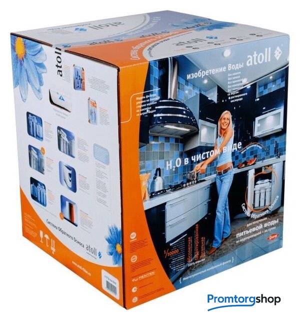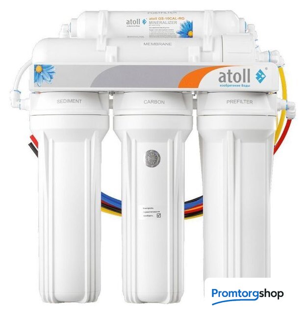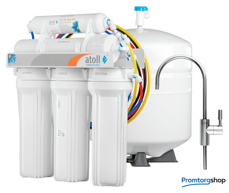 Прочее | Система состоит из:Трех префильтров:atoll P5. Полипропиленовый фильтр механической очистки. Поры элемента задерживают нерастворимые частицы крупнее 5 мкм. Удаляет из воды взвесь песка, ржавчины, грязи;atoll GАС-10 (гранул.уголь). Очищение гранулированным активированным углем. Эффективен в отношении примесей хлора, органических соединений;atoll P1. Полипропиленовый фильтр тонкой очистки. Удаление нерастворимых загрязнений до 1 микрона.Обратноосмотической мембраны atoll TW40-1812-50. Задерживает до 99.9% загрязнений, оставляет только молекулы воды и кислорода. Часть неочищенной воды уходит в дренаж вместе с загрязнениями, задержанными мембраной.Емкость для хранения запаса очищенной воды. Бак может быть наполнен за 2 часа. Обеспечивает постоянное наличие питьевой воды и комфортную скорость подачи воды из питьевого крана.Постфильтра atoll GS-10CAL/RO на основе порошка кокосового активированного угля. Дополнительная фильтрация перед подачей в кран. Проводит минерализацию микроэлементами кальция, придает воде приятный вкус.Крана чистой воды Atoll. Подает очищенную воду из фильтра |