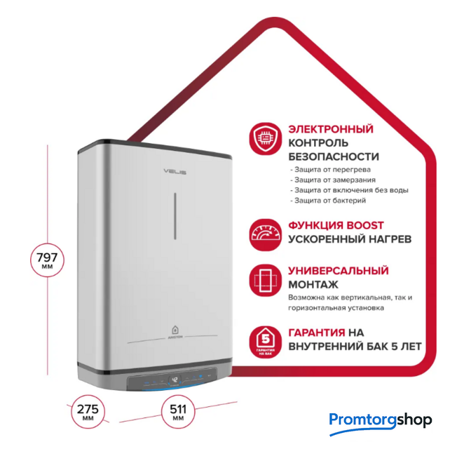 | Тип | накопительный. Особенности : Электронное управление. Встроенный Wi-Fi модуль. Cухой нагревательный элемент. Функция Boost - еще больше горячей воды, благодаря попеременной работе двух ТЭНов 1,5 кВт/1,5 кВт и увеличению максимальной температуры до 80 °С. Передовая конструкция для быстрого нагрева и экономии электроэнергии. Точная настройка и отображение температуры. Глубина 27 см экономит пространство. Возможность горизонтального и вертикального монтажа. +16% горячей воды за то же время благодаря технологии WaterPlus. Cистема автодиагностики. Идеальное соотношение дизайна и производительности. Экономия электроэнергии до 14%. Эмалевое покрытие TitanShield защищает внутренний бак от коррозии. Трехступенчатая электронная система защиты. Защита от перегрева. Сверхпрочный бак - тестирование при 16 атм. Увеличенный магниевый анод для дополнительной защиты. Профессиональная система защиты от бактерий. Предохранительный клапан в комплекте. |
