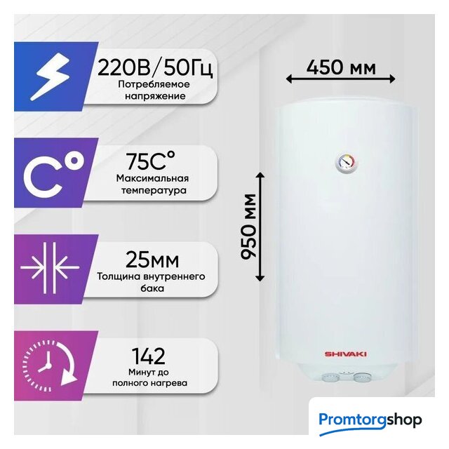 150 л, 2 кВт, время нагрева 210 мин, 135×45×45 см