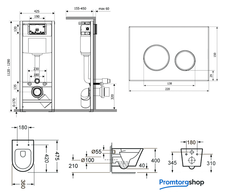 подвесной, без бачка, задний подвод воды, горизонтальный выпуск, двухрежимный слив, с сиденьем