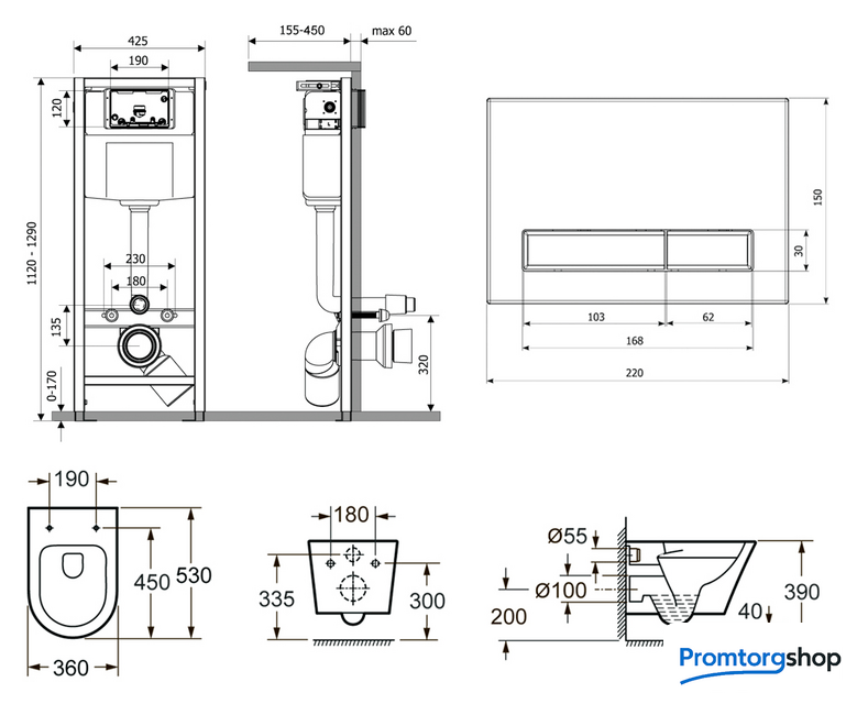 подвесной, без бачка, задний подвод воды, горизонтальный выпуск, двухрежимный слив, с сиденьем
