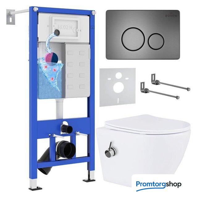 Унитаз подвесной Roxen Antares Bidet в комплекте с инсталляцией StounFix Dual Fresh 6 в 1 962282 (кнопка: оружейная сталь)