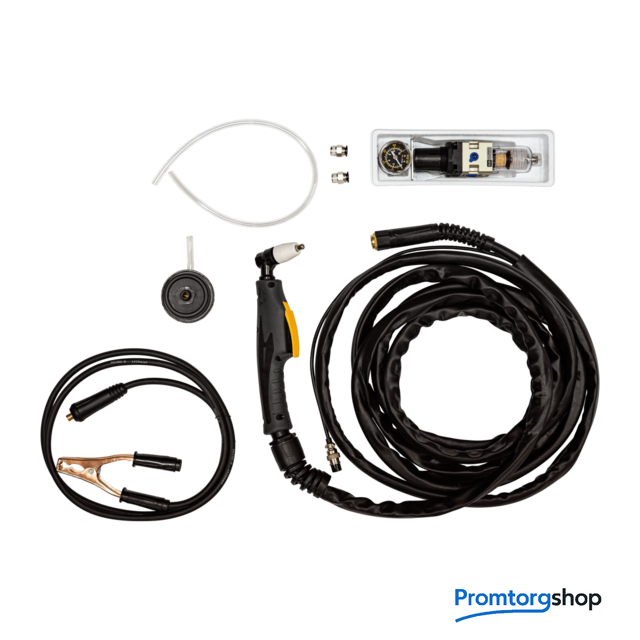 Комплект поставки | аппарат воздушно−плазменной резки, резак с руковом, газовая трубка, воздушный фильтр−регулятор с манометром, наконечник электрода (2 шт), клемма (заземления с кабелем 1.7 м), горелка (сварочная 4.7 м), инструкция, документация |
