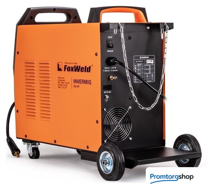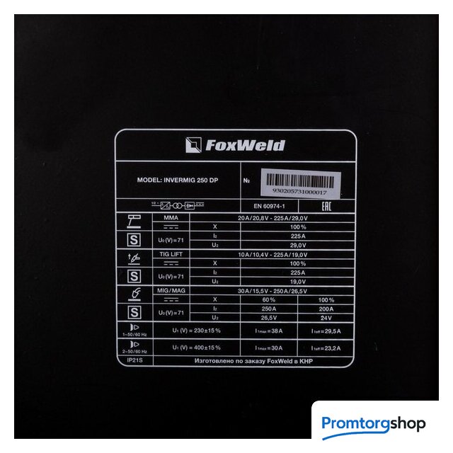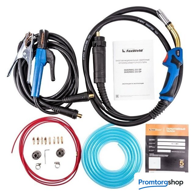 | Комплект поставки | • Сварочный полуавтомат FOXWELD INVERMIG 250 DP – 1 шт.;• Горелка MB 24 MIG 3 м (с каналом 0,8 - 1,0 мм для стали) – 1 шт.;• Электрододержатель 300 А 25 мм², 3 м – 1 шт.;• Масса с зажимом 300 А 25 мм², 3 м – 1 шт.;• Тефлоновый канал (красный 1,0/1,2) 3 м для сварки алюминия – 1 шт.;• Контактные наконечники для стали 0,8 мм – 2 шт.;• Контактные наконечники для стали 1,0 мм – 2 шт.;• Контактные наконечники для алюминия 1,0 мм – 2 шт.;• Контактные наконечники для алюминия 1,2 мм – 2 шт.;• Ролик с V-образной канавкой 0,8/1,0 мм – 2 шт. (в аппарате);• Ролик с U-образной канавкой 1,0/1,2 мм – 2 шт.;• Хомут для шланга – 2 шт.;• Газовый шланг 3 м – 1 шт.;• Руководство пользователя – 1 шт.;• Гарантийный талон (5 лет) – 1 шт. |