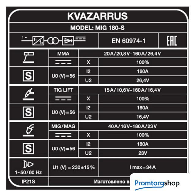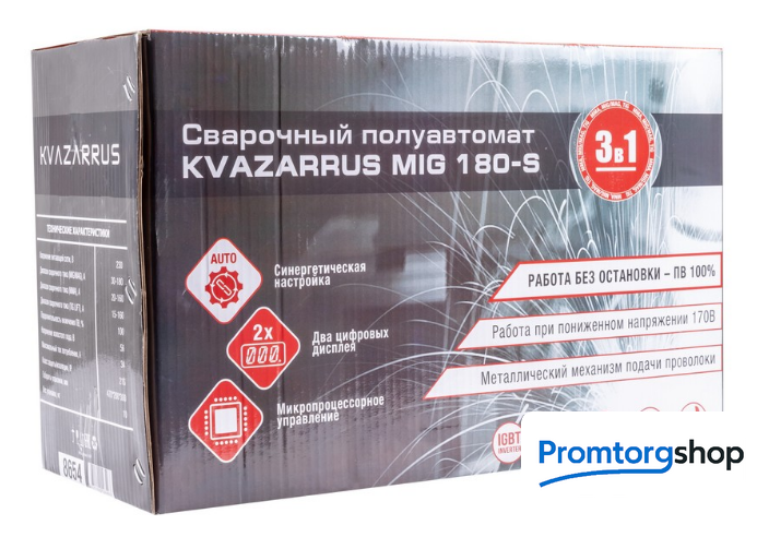 | Назначение | MIG/MAG, MMA, TIG Lift. Сварочный полуавтомат инверторного типа FOXWELD KVAZARRUS MIG 180-S с синергетическим управлением предназначен для полуавтоматической сварки в среде инертных и активных газов с использованием самозащитной проволоки в режиме MIG, а также для дуговой сварки штучным электродом в режиме ММА и аргонодуговой сварки вольфрамовым электродом при помощи вентильной горелки (TIG LIFT). Полуавтомат KVAZARRUS MIG 180-S применяется для использования в быту: в производстве стальных конструкций, для выполнения кузовного ремонта автомобилей и т.п. Управление параметрами сварки за счет "умных" предустановок синергетического меню облегчают настройку сварочного аппарата одной кнопкой. СИНЕРГЕТИЧЕСКИЙ РЕЖИМ УПРАВЛЕНИЯ Синергетическое управление дает возможность модифицировать все сварочные параметры, осуществляя регулировку лишь одного из них. Наличие синергетического режима управления позволяет легко и быстро настроить аппарат под любую задачу. Преимущества синергетики: простота в настройке даже неквалифицированным персоналом, быстрая установка сварочных параметров, гарантированное получение качественного сварного соединения. МНОГОФУНКЦИОНАЛЬНОСТЬ 5-В-1 Благодаря своей многофункциональности (5 режимов сварки), аппарат позволяет проводить следующие виды работ: полуавтоматическую сварку (MIG/MAG) сплошной проволокой в среде защитного газа, полуавтоматическую сварку (FLUX WIRE) самозащитной проволокой без использования защитного газа, ручную дуговую сварку (ММА) на постоянном токе штучным электродом с рутиловым и основным покрытием, аргонодуговую сварку (TIG LIFT) на постоянном токе с возбуждением дуги касанием вольфрамового электрода. ЦИФРОВОЙ ДИСПЛЕЙ Над органами управления расположены 2 цифровых экрана для точного отображения параметров сварочного тока и напряжения, что упрощает настройку режимов при сварочных работах. Цифровой дисплей сварочного напряжения отображает значения во время сварки в режиме полуавтоматической сварки (CO2, ArCO2). В TIG и MMA отображает значение напряжения в режиме настройки и сварки. Цифровой дисплей сварочного тока отображает установленные значения тока в режиме настройки. Во время сварки отображает фактические значения сварочного тока. РАБОТА ПРИ ПОНИЖЕННОМ НАПРЯЖЕНИИ Сварочные аппараты инверторного типа с транзисторами IGBT ((Insulated Gate Bipolar Transistor) сохраняют работоспособность при отклонениях напряжения в пределах 220 В ±15%, что позволяет продолжить работу при пониженном и нестабильном напряжении электрической сети. РУЧНАЯ КОРРЕКТИРОВКА ДЛИНЫ ДУГИ Функция корректировки длины дуги позволяет изменять вручную напряжение в процессе сварки. Это даёт возможность компенсировать потери сварочного напряжения, например, из-за слишком длинного кабеля. Также с помощью ручной регулировки можно усилить сварной шов, изменить его форму – сделать более пологим или повысить растекаемость. Преимущества: Работа на малых токах (для сварки изделий небольших толщин) Работа при пониженном напряжении Синергетический подбор режимов для быстрой настройки аппарата Ручная дуговая сварка штучным покрытым электродом (ММА) на постоянном токе Аргонодуговая сварка (TIG LIFT) на постоянном токе Лёгкое переключение полярности при полуавтоматической сварке для использования самозащитной проволоки (FLUX) Hot Start, Arc Force и Antisticking в режиме 