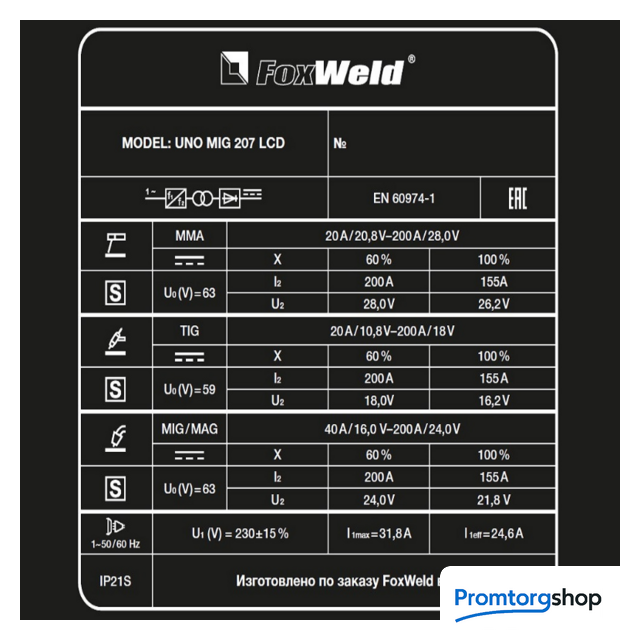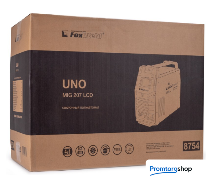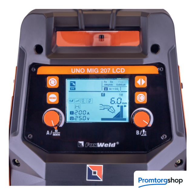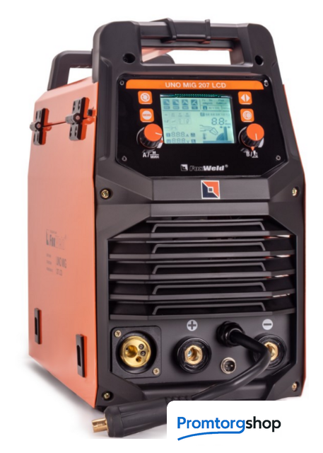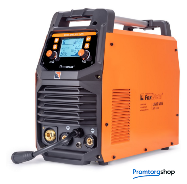 | Назначение | Сварочный полуавтомат FOXWELD UNO MIG 207 LCD — это многофункциональный сварочный аппарат с полностью цифровым управлением, который позволяет производить сварку изделий из углеродистой и нержавеющей стали, а также алюминиевых и медных сплавов. Синергетическое управление в режиме полуавтоматической сварки дает возможность модифицировать все сварочные параметры, осуществляя регулировку лишь одного из них – толщины металла. Наличие жидкокристаллического дисплея (LCD) облегчает процесс настройки аппарата, тем самым позволяя оптимизировать рабочее время сварщика. FOXWELD UNO MIG 207 LCD поддерживает следующие режимы сварки: полуавтоматическую сварку (MIG/MAG) сплошной проволокой в среде защитных газов, полуавтоматическую сварку (FLUX) самозащитной проволокой без использования защитного газа, ручную дуговую сварку (ММА) на постоянном токе штучным электродом и аргонодуговую сварка (TIG LIFT) на постоянном токе с возбуждением дуги касанием вольфрамового электрода. РЕЖИМ ХОЛОДНАЯ СВАРКА При минимальном времени сварки происходит значительное уменьшение тепловложения в деталь, за счёт чего достигается легкая сварка тонких материалов. Помимо этого, уменьшается деформация металлических листов и обеспечивается быстрая и качественная точечная сварка. АДАПТИРОВАН ПОД СВАРКУ АЛЮМИНИЯ Сварка алюминия широко востребована в производстве, т.к. этот металл часто используется как конструкционный материал для изготовления деталей приборов, машин и сооружений. Базовая комплектация включает в себя наличие тефлонового канала, специального ролика и наконечника на горелку, что позволяет без дополнительных покупок приступить к работе с алюминиевой проволокой. Оператор сварочного аппарата может воспользоваться специально созданной программой работы с алюминиевыми сплавами синергетической системой управления. МНОГОФУНКЦИОНАЛЬНОСТЬ 4-В-1 Благодаря своей многофункциональности, аппарат позволяет проводить следующие режимы сварки: полуавтоматическую сварку (MIG/MAG) сплошной проволокой в среде защитных газов, полуавтоматическую сварку (FLUX) самозащитной проволокой без использования защитного газа, ручную дуговую сварку (ММА) на постоянном токе штучным электродом и аргонодуговую сварку (TIG LIFT) на постоянном токе с возбуждением дуги касанием вольфрамового электрода. ЦИФРОВОЙ ДИСПЛЕЙ Большой LCD экран c понятным меню плюс система индикаций, исполненная через пиктограммы, позволяют создать комфортные условия при работе с данным сварочным аппаратом. Удобная комбинация кнопочных выключателей с ручками плавной регулировки позволяет сосредоточится именно на сварке и не тратить много сил и внимания на настройки во время работы. РАСШИРЕННЫЙ СИНЕРГЕТИЧЕСКИЙ РЕЖИМ УПРАВЛЕНИЯ Синергетическое управление дает возможность модифицировать все сварочные параметры, осуществляя регулировку лишь одного из них. Наличие синергетического режима управления позволяет легко и быстро настроить аппарат под любую задачу. Преимущества синергетики: простота в настройке даже неквалифицированным персоналом, быстрая установка сварочных параметров, гарантированное получение качественного сварного соединения. Помимо этого, в режиме полуавтоматической сварки есть режим точечной сварки для прихваток свариваемых изделий. В режимах ММА и TIG LIFT при изменении значения с