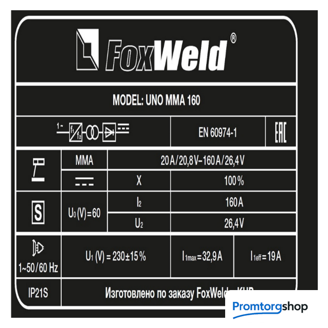 | Комплект поставки | Сварочный аппарат UNO MMA 160 – 1 шт.; • Электрододержатель 200 А, 3 м – 1 шт.; • Зажим заземления 200 А, 3 м – 1 шт.; • Инструкция – 1 шт.; • Гарантийный талон – 1 шт. |