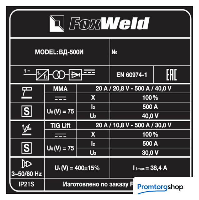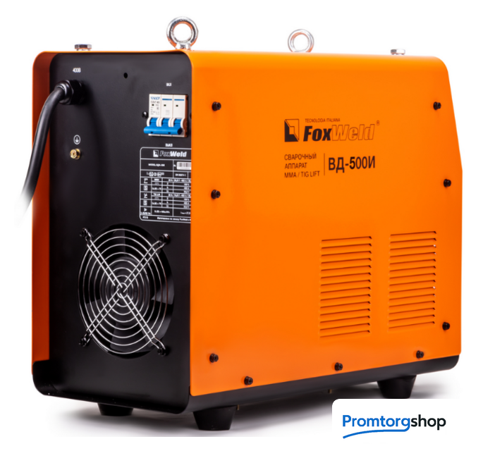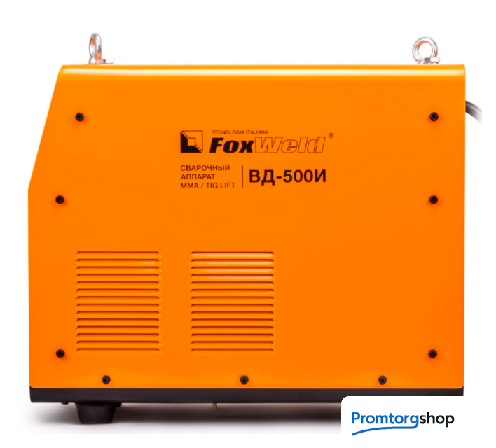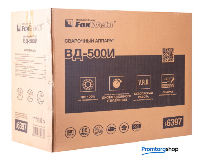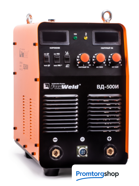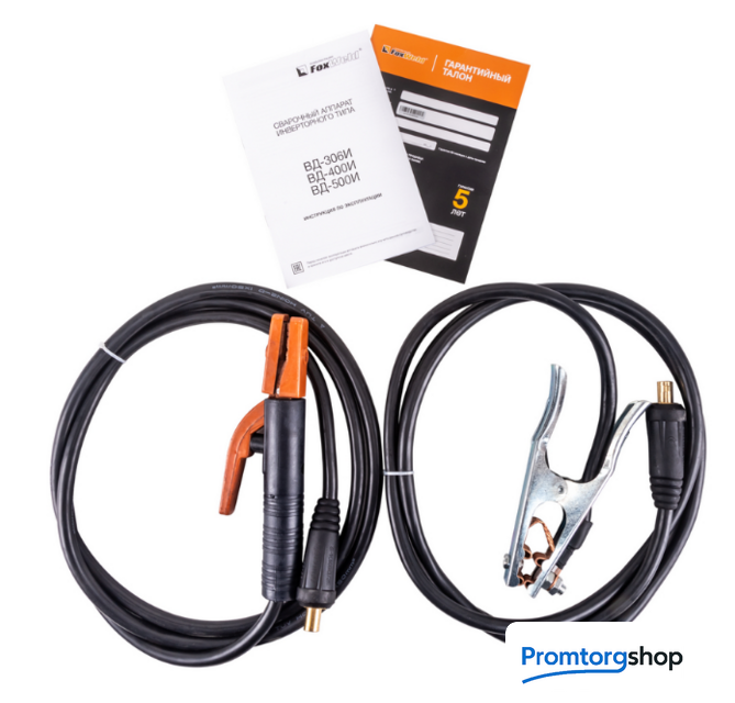 | Комплект поставки | • Сварочный аппарат FOXWELD ВД-500И – 1 шт.; • Электрододержатель со сварочным кабелем 50 мм² (Cu), 3 м – 1 шт.; • Зажим на массу со сварочным кабелем 50 мм² (Cu), 3 м – 1 шт.; • Сетевой кабель 400 В, 4х4 мм², 2,5 м – 1 шт.; • Инструкция + гарантийный талон – 1 компл. |