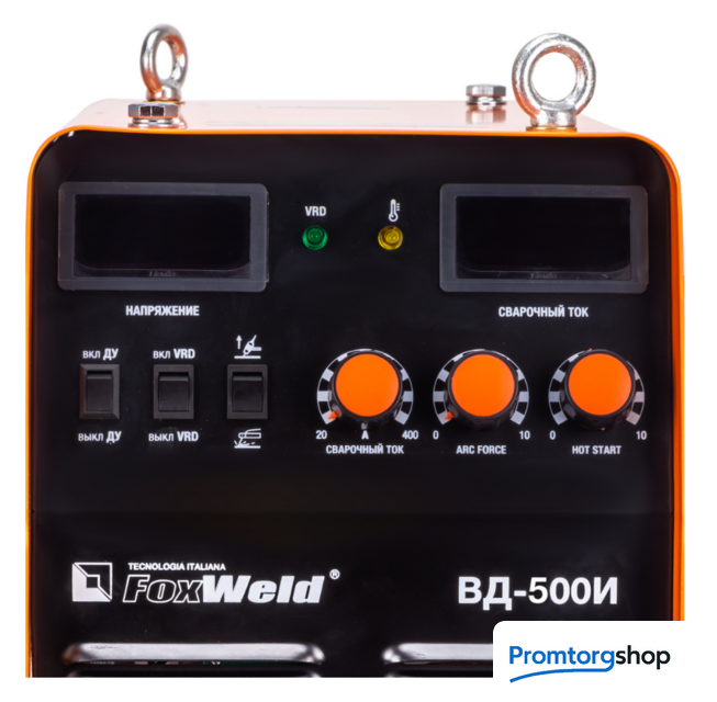 | Назначение | Сварочный аппарат ВД-500И — современный инверторный источник ручной дуговой сварки с дополнительным режим аргонодуговой сварки TIG LIFT, который позволяет работать со сплавами меди, титана и чугуна. Регулируемые функции Arc Force (форсаж дуги) и Нot Start (горячий старт) необходимы сварщикам для их комфортной и уверенной работы. Отключаемая функция VRD (снижение напряжения холостого хода) повышает безопасность и исключает риск поражения сварщика электрическим током. Разъём ДУ позволяет подключить пульт для дистанционного управления аппаратом. Благодаря трёхфазному питанию от 400 вольт даже при максимальном сварочном токе вся нагрузка равномерно распределяется на 3 линии производственной площадки, не перегружая и не перегревая какую-то одну из них. Аппарат специально разработан по принципу тоннельной вентиляции, которая защищает электронику от попадания внутрь пыли, стружки и влаги. МНОГОФУНКЦИОНАЛЬНОСТЬ 2-В-1 Сварочный аппарат ручной дуговой сварки имеет дополнительный режим TIG Lift, который позволяет проводить аргонодуговую сварку на постоянном токе изделий из чёрной и нержавеющей стали, меди, титана, чугуна. Данный вид сварки характеризуется отсутствием брызг и более презентабельным внешним видом сварного шва. РАБОТА БЕЗ ОСТАНОВКИ Параметр ПВ 100% на максимальном токе при КПД 85% обеспечивает бесперебойную устойчивую работу сварочного аппарата в течении всего рабочего дня. Это позволяет производить безостановочный сварочный процесс и выполнять работы, которые требуют больших временных затрат, что повышает скорость и производительность. РЕГУЛИРУЕМАЯ ФУНКЦИЯ ФОРСАЖ ДУГИ Регулировка Arc Force (Форсаж дуги) позволяет изменять вручную напряжение в процессе сварки. Это даёт возможность компенсировать потери сварочного напряжения, например, из-за слишком длинного кабеля. Также с помощью ручной регулировки можно усилить сварной шов, изменить его форму – сделать более пологим или повысить растекаемость. ФУНКЦИЯ СНИЖЕНИЯ НАПРЯЖЕНИЯ ХОЛОСТОГО ХОДА Функция VRD (снижение напряжения холостого хода) повышает безопасность и исключает риск поражения сварщика электрическим током. Сварочный процесс становится более безопасным в замкнутых пространствах и при сварке в условиях повышенной влажности. ИНФОРМАТИВНАЯ ПАНЕЛЬ УПРАВЛЕНИЯ На панели управления сварочного аппарата расположены 2 цифровых дисплея (показывают установленное значение сварочного тока и значение выходного напряжения) и 2 индикатора перегрева/неисправности и работы функции VRD (снижение напряжения холостого хода). Тремя ручками устанавливается значение сварочного тока, а также регулируются специальные функции Hot Start (горячий старт) и Arc Force (форсаж дуги). С помощью трёх кнопок можно включать пульт дистанционного управления, функцию VRD и режим TIG Lift. Преимущества: Охлаждение силовых элементов осуществляется эффективным и мощным вентилятором Работа сварочных процессов и управление параметрами устройства осуществляется через микропроцессор Простая и удобная система управления сварочными параметрами Профессиональный комплект поставки с медными проводами Продолжительность работы: ПВ – 100% Промышленное исполнение, максимальная степень надёжности компонентов и электронных элементов Принцип тоннельной вентиляции: управляющая электроника находится в верхнем 