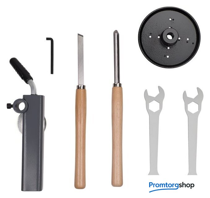 Комплект поставки | - станок, - планшайба (1 шт), - гаечный ключ (2 шт), - шестигранный ключ (1 шт), - винт фиксации опоры (1 шт), - стамески (2 шт), - руководство по эксплуатации. |