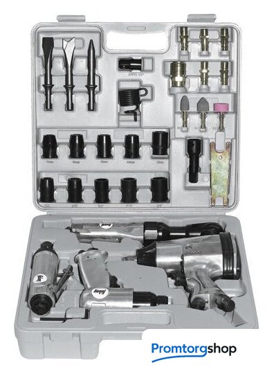 Комплектация | В комплект набора входят: пневмодолото, 3 зубила 120 мм с круглым хвостовиком, пневмогайковерт, 10 головок 1/2", 1 угловой пневмогайковерт, пневмошлифмашина, 3 шлифкамня 6 мм, 1 ключ шестигранный 6 мм, 1 разъем рапид муфта, 2 гаечных ключа, 1 возвратная пружина, 6 разъемов рапид штуцер, 1 удлинитель 1/2" на 75", 1 масленка, 1 переходник 3/8" на 1/2" |
